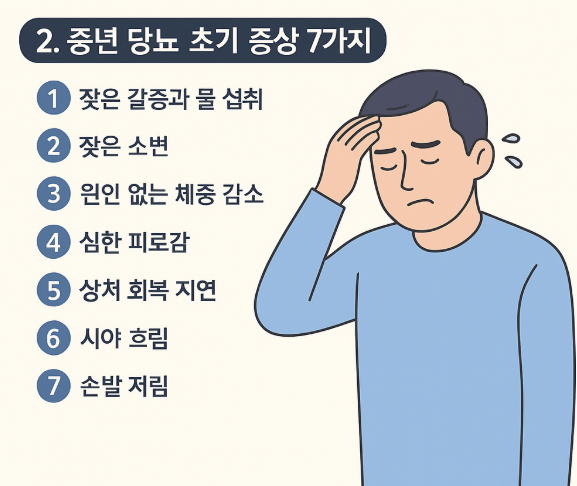 당뇨는 조기 발견과 관리가 가장 중요합니다. 중년이라면 평소 작은 몸의 신호를 놓치지 말고, 생활습관을 개선해 건강한 혈당을 유지하는 것이 최선의 예방책입니다. 오늘부터 식습관과 운동을 점검해 보세요.